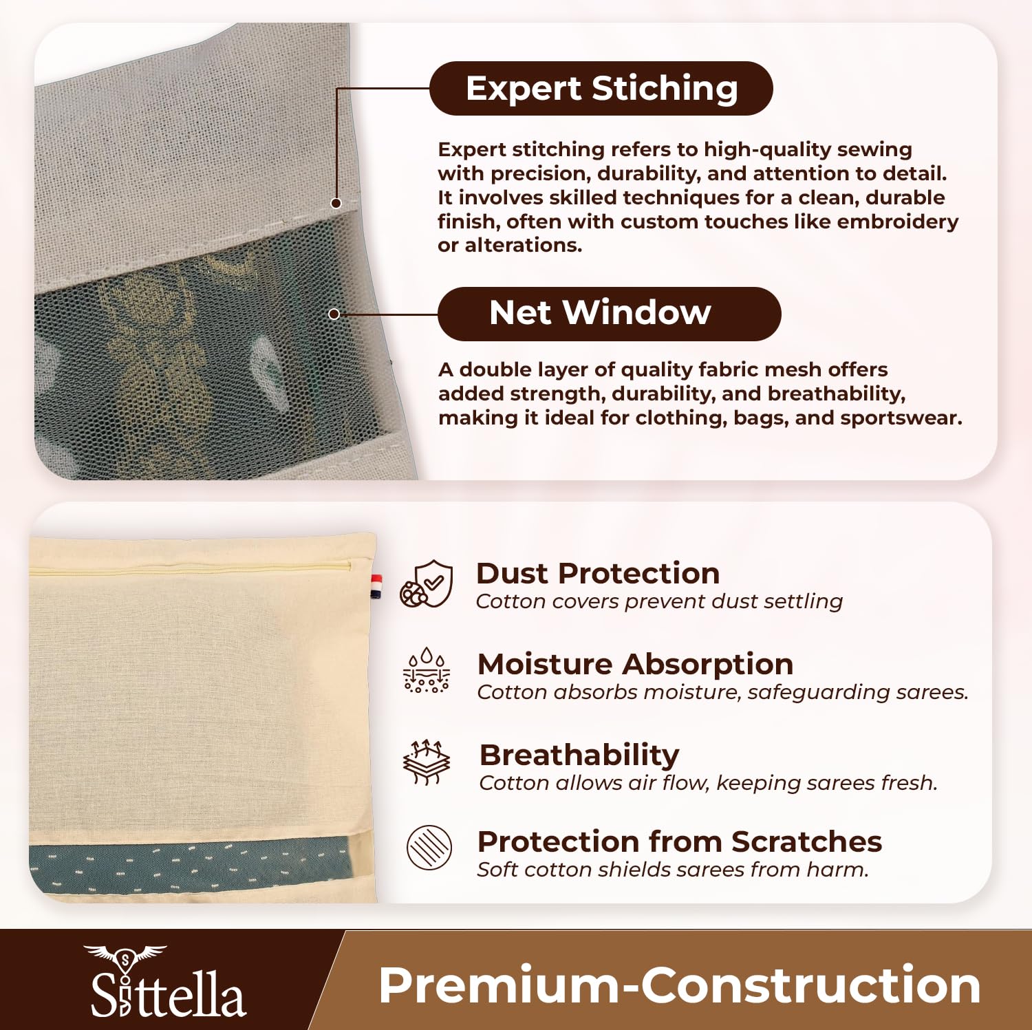 CARE DETAILS: The saree bags are washable and reusable so for regular storage use you need to wash the covers after some time. use mild detergent and do not use hot water. after washing please IRON the bag so it comes in a fresh look. COTTON SAREE COVER DETAILS: SITTELLA saree covers / bags are made of high-quality, 250 GSM durable cotton. They are made of fabric, so you can use them after washing if they become dirty. Cotton is highly superior to other materials like plastic and non-woven for storage purposes. The material is soft, and it cares for your precious sarees, dresses, lehengas, and other outfits.