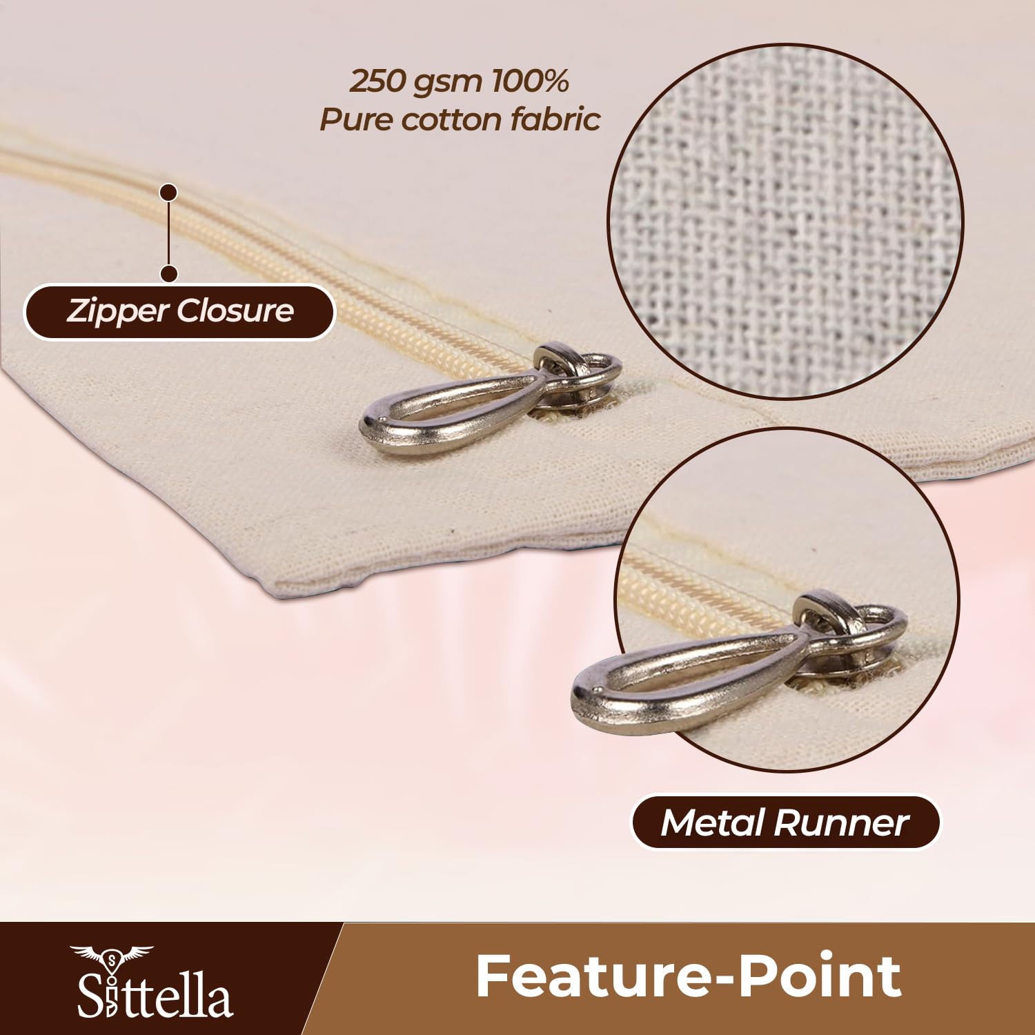 COTTON SAREE COVER DETAILS: SITTELLA saree covers / bags are made of high-quality, 250 GSM durable cotton. They are made of fabric, so you can use them after washing if they become dirty. Cotton is highly superior to other materials like plastic and non-woven for storage purposes. The material is soft, and it cares for your precious sarees, dresses, lehengas, and other outfits. CLOSURE & STITCHING DETAILS: These saree covers come with zip closure with a metal runner. As you can see in the photos saree bags contain high-quality chain. The stitching of saree bags is done with trained women and SITTELLA ensures quality stitching. The thread used the same color of fabric.