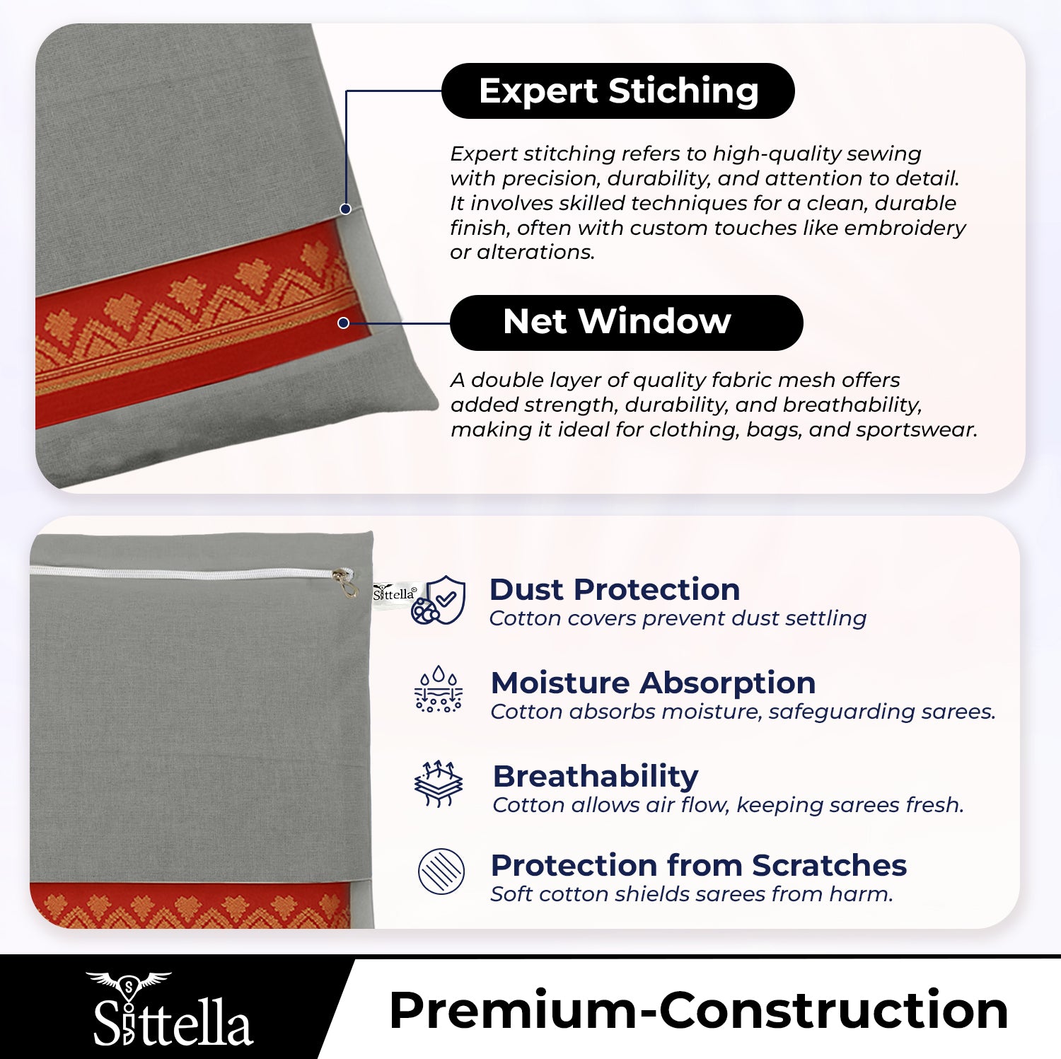 CLOSURE & STITCHING DETAILS: These saree covers come with zip closure with a metal runner. As you can see in the photos saree bags contain high-quality chain. The stitching of saree bags is done with trained women and SITTELLA ensures quality stitching. The thread used the same color of fabric.