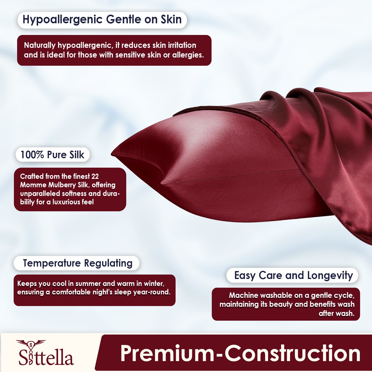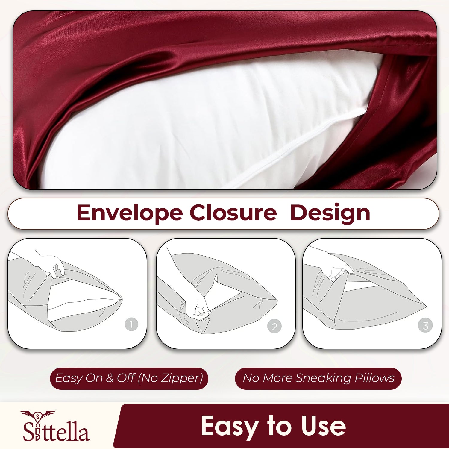 ✅ STYLE: Super soft satin fabric cover in Maroon color, 28x16 inches. ✅ EXCLUSIVE DESIGN: Envelope closure prevents pillow escape, offering a unique and pleasant experience without zippers.