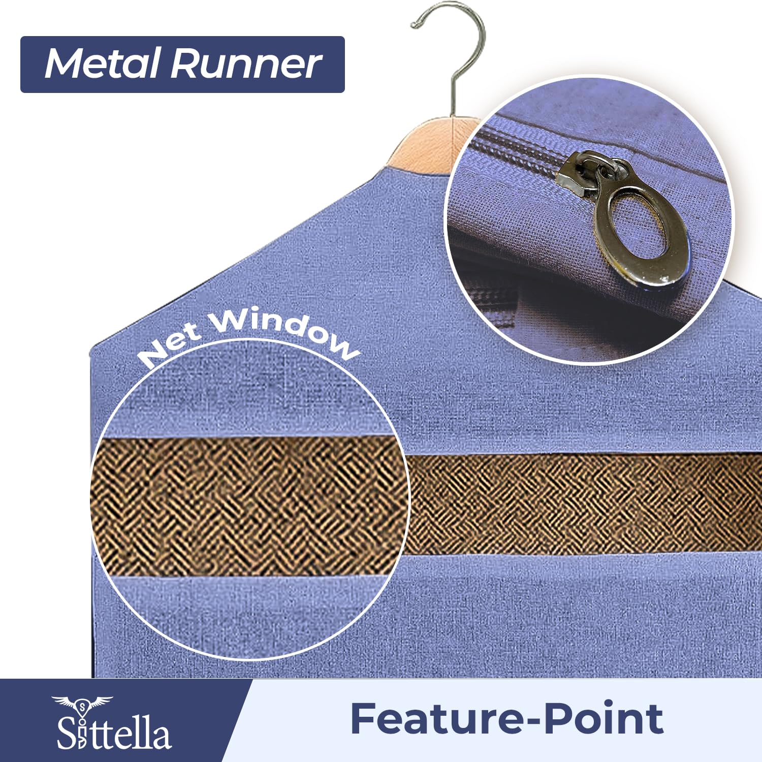 The SITTELLA Hanging Cotton Saree Cover (30 x 18 Inches) is a practical and durable solution for organizing sarees and clothes in your wardrobe. Made from premium breathable cotton fabric, it keeps your sarees dust-free while allowing proper air circulation for long-term storage. Strong stitching ensures the cover can easily hold multiple sarees without losing shape.This hanging saree cover for storage is compatible with all standard hangers and features a smooth backside zip with a durable metal runner for easy use. A front mesh window allows quick identification of stored clothes without opening the cover. The bottom-closed design keeps sarees neatly inside, maintaining a clean and uniform wardrobe look.Ideal for sarees, suits, and ethnic wear, this cotton saree cover is perfect for everyday use and gifting.