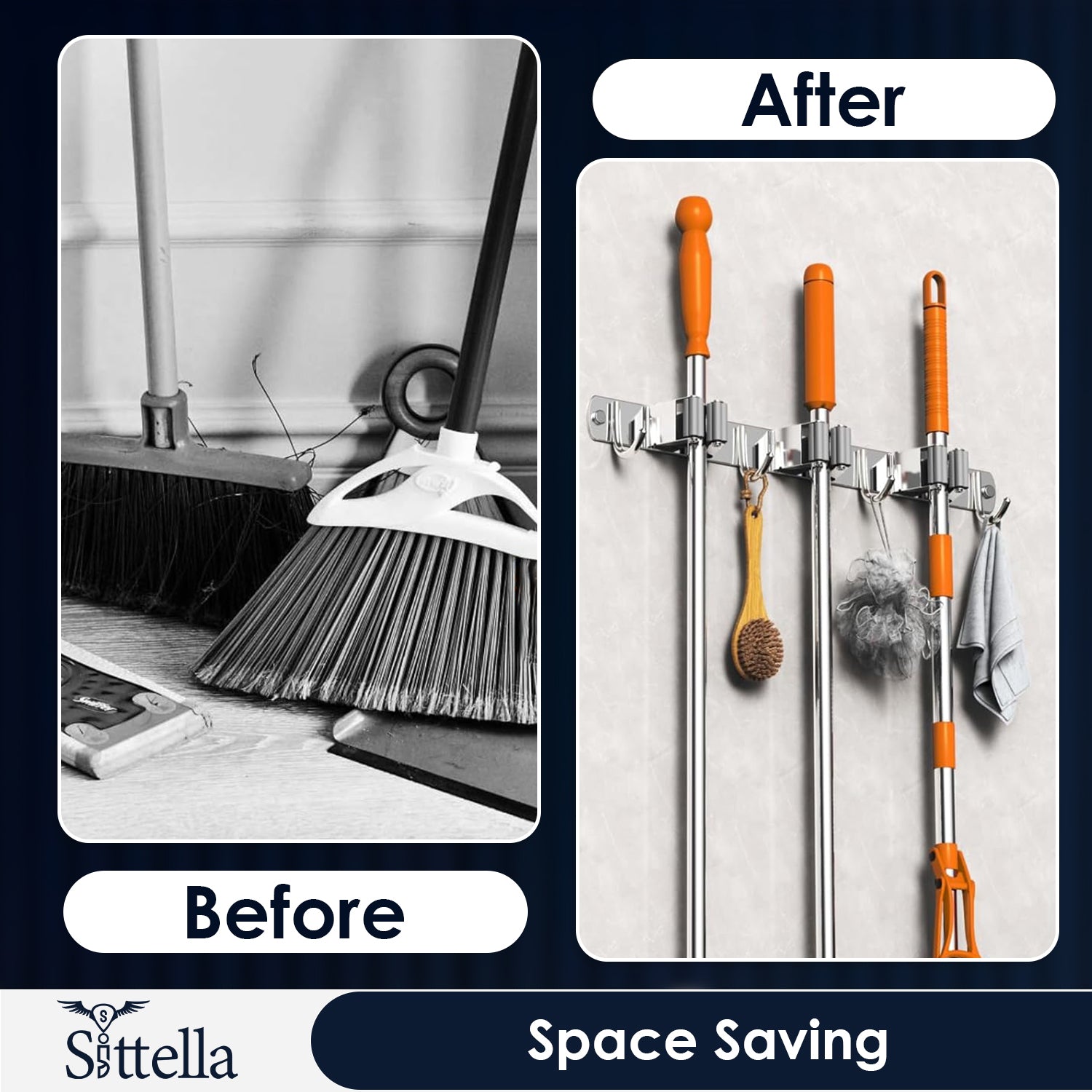 Stainless Steel 3 Racks with 4 Hooks Wall Mounted Broom and Mop Stick Holder, Hanging Tools for Home Kitchen Garden Laundry Garage (Silver)